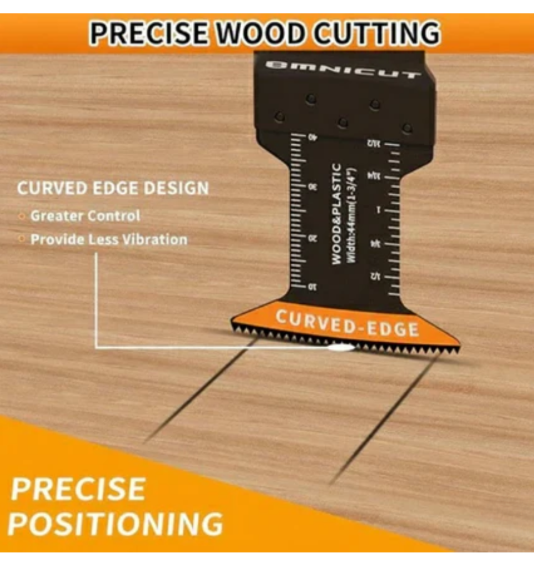 Color-coded by material type. Yellow (wood), black (metal), orange (precision). Plus clear measurement markings on each blade.